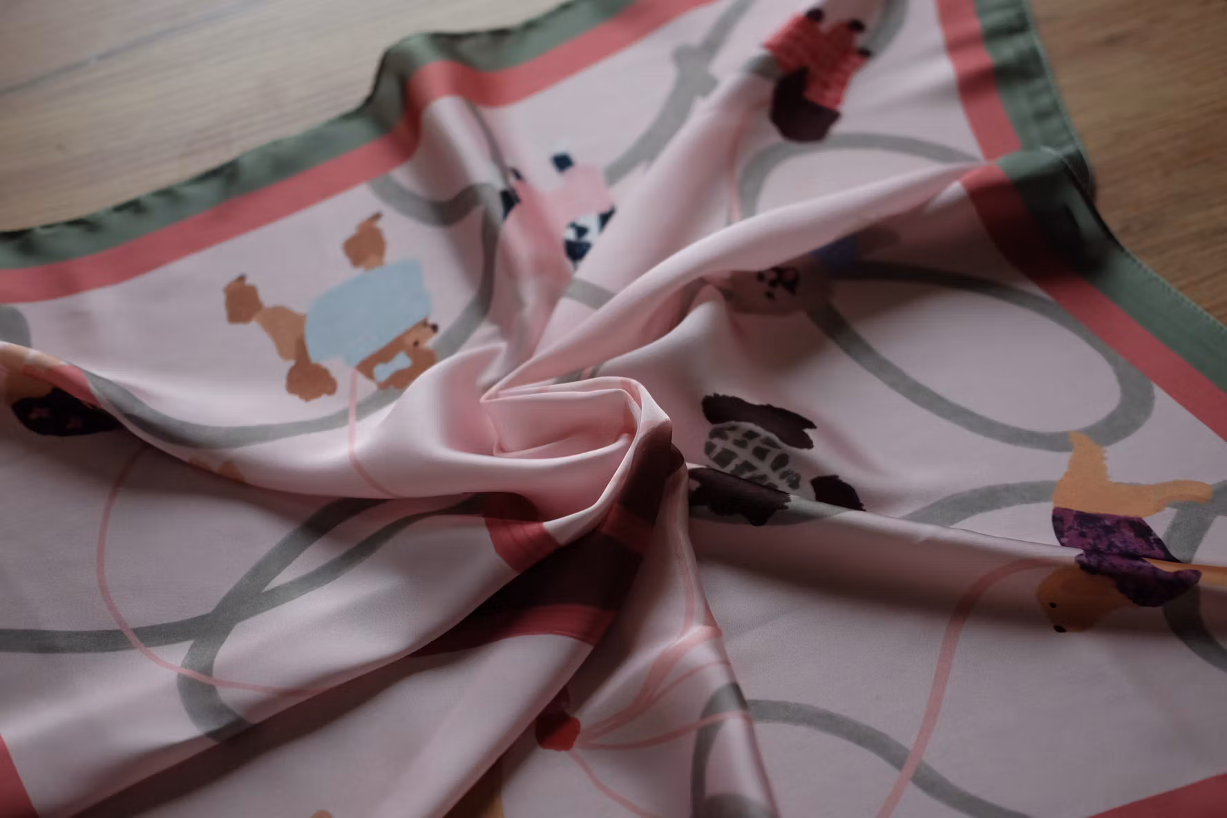 Den mjuka och följsamma satinstrukturen ger en vacker lyster som lyfter varje outfit. Scarfens eleganta uttryck gör den till en härlig accessoar – perfekt att bära runt halsen, i håret, som näsduk, knuten på väskan eller varför inte matcha med sin fyrbenta vän.
